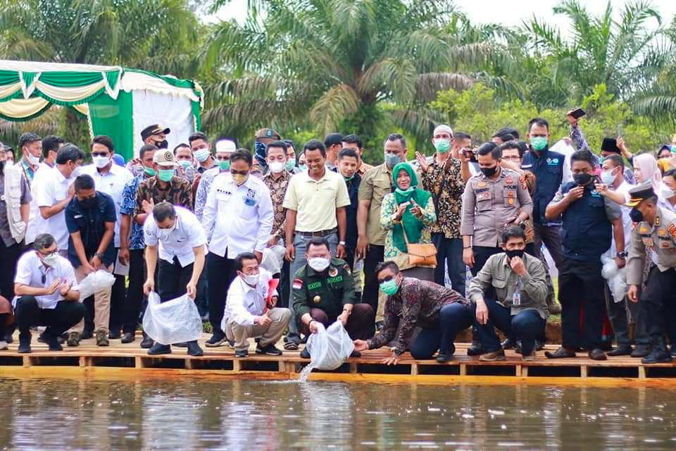 Bekawan.com – Bupati Kampar, H. Catur Sugeng Susanto, SH, MH mendampingi Sekjen Kementerian Kelautan Drs Antam Novambar melakukan penebaran bibit (restocking) ikan Ikan Baung dan Masher yang dilepaskan di Lubuk Larangan Desa Pulau Belimbing Kecamatan Kuok, Jumat (18/3/2022).