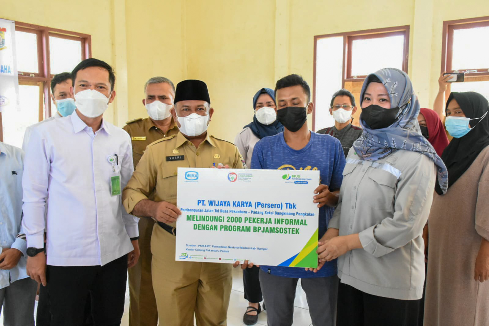 BPJS Ketenagakerjaan Cabang Pekanbaru menyerahkan secara simbolis Kartu Kepesertaan Pekerja Informal bukan Penerima Upah CSR Badan Usaha di Kabupaten Kampar yang dilaksanakan di Gedung Serba Guna Desa Gema Kecamatan Kampar Kiri Hulu, Senin (20/3/2022).