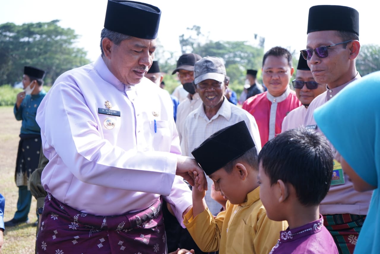 Bupati Alfedri bersalaman dengan seorang anak di acara Bujang Kampung. Foto: Diskominfo Siak