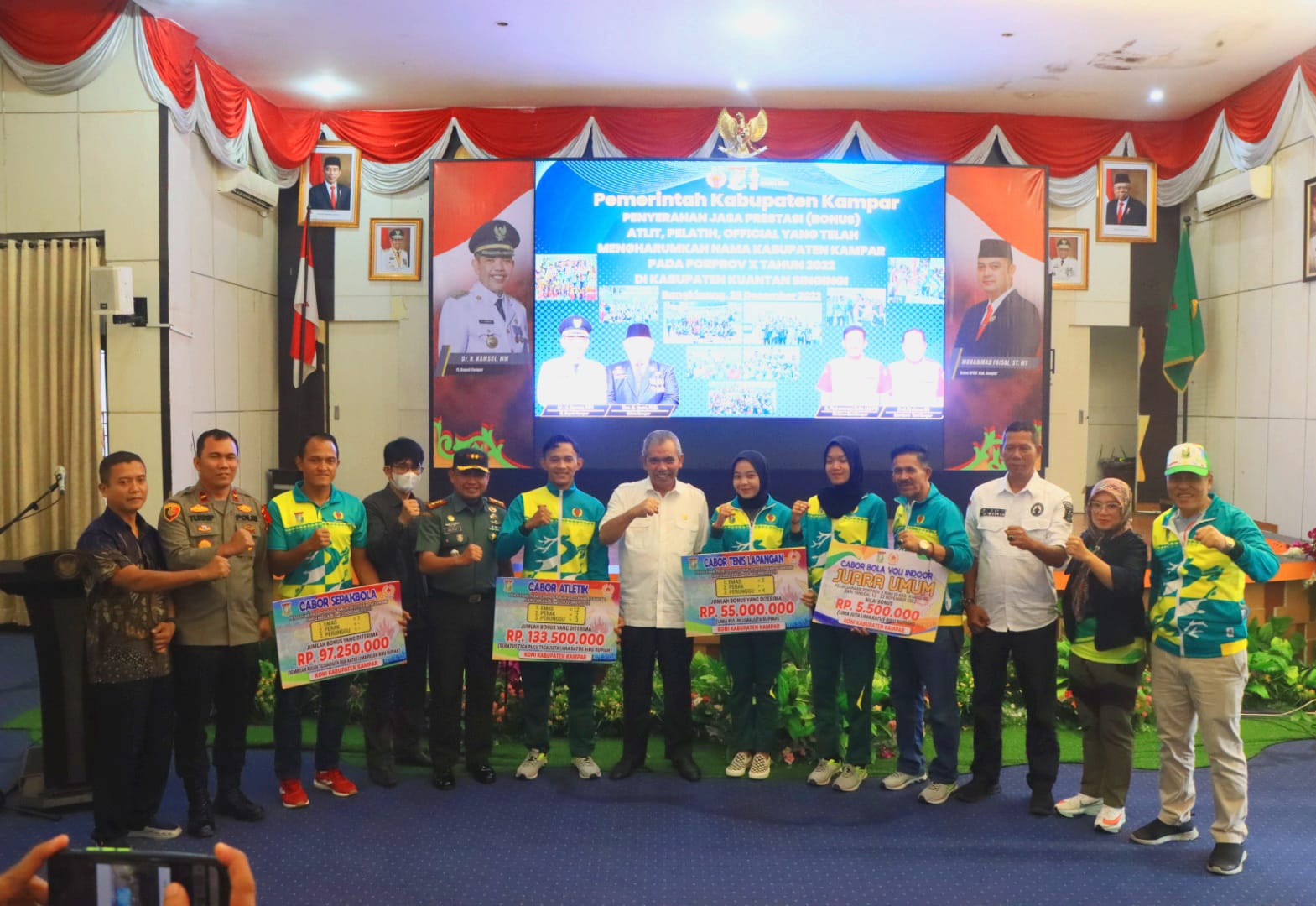 Bekawan.com – Pj. Bupati Kampar Dr. H. Kamsol MM menyerahkan bantuan prestasi atau bonus kepada atlet peraih medali di ajang Pekan Olahraga Provinsi (Porprov) X Riau Tahun 2022, acara penyerahan bonus digelar di Aula Rumah Dinas Bupati Kampar, Rabu (28/12). Total bonus yang diserahkan Kamsol mencapai 1,3 Miliar rupiah.