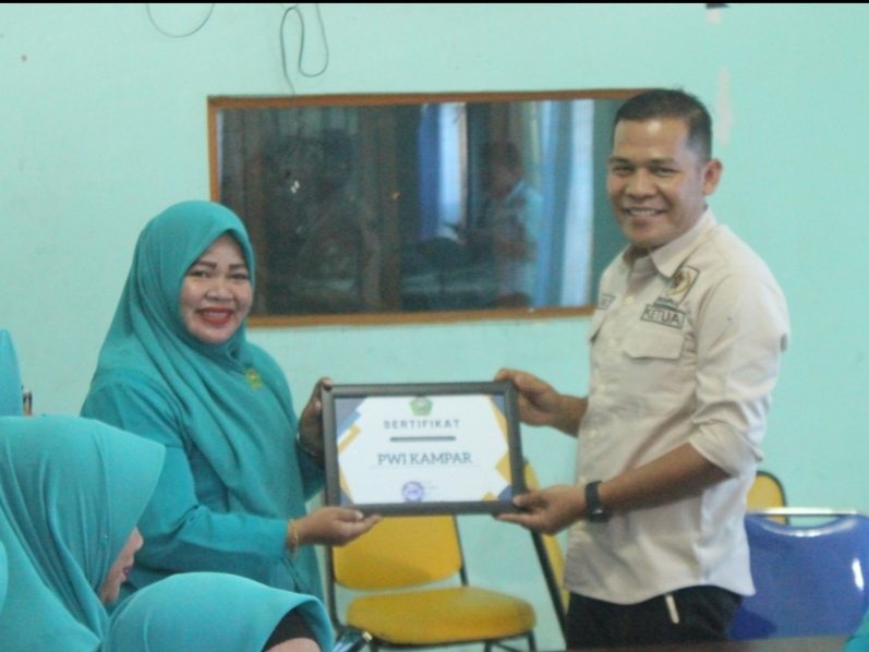Ketua GOW Kabupaten Kampar Ny. Erni Haerani Repol, S. Pd., MM Saat Menyerahkan Sertifikat Penghargaan Kepada Ketua PWI Kampar Akhir Yani, SE