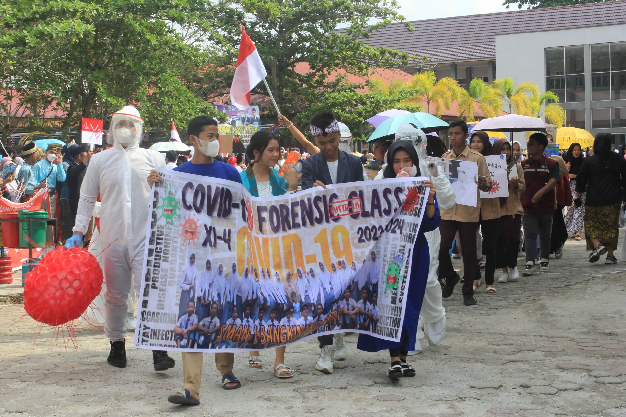 Dari pantauan di lapangan, ratusan siswa-siswi SMA I Bangkinang Kota menampilkan sejumlah peran dan aktraksi unik sesuai tema yang mereka dapatkan di Pawai Akbar, mulai dari kondisi masyarakat zaman penjajahan, zaman kerajaan, petugas kesehatan saat covid lengkap dengan pakaian APD, hingga korban perang.
