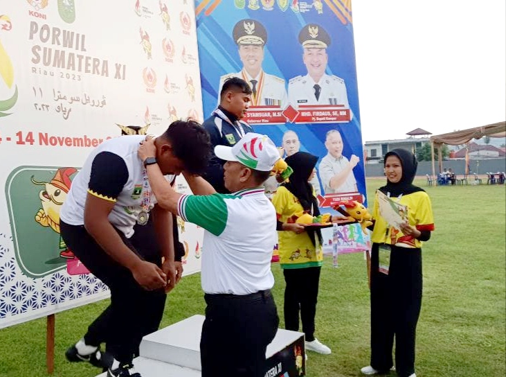 Ketua KONI Kampar Kalungkann Medali Pemenang Porwil Cabor Atletik Kampar