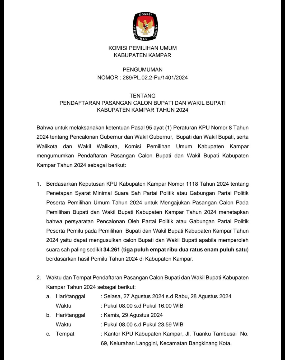 1. Berdasarkan Keputusan KPU Kabupaten Kampar Nomor 1118 Tahun 2024 tentang Penetapan Syarat Minimal Suara Sah Partai Politik atau Gabungan Partai Politik Peserta Pemilihan Umum Tahun 2024 untuk Mengajukan Pasangan Calon Pada Pemilihan Bupati dan Wakil Bupati Kabupaten Kampar Tahun 2024 menetapkan bahwa persyaratan Pencalonan Oleh Partai Politik atau Gabungan Partai Politik Peserta Pemilupada Pemilihan Bupati dan Wakil Bupati Kabupaten Kampar Tahun 2024 yaitu dapat mengusulkan calon Bupati dan Wakil Bupati apabila memperoleh suara sah paling sedikit 34.261(tiga puluh empat ribu dua ratus enam puluh satu) berdasarkan hasil Pemilu Tahun 2024 di Kabupaten Kampar.