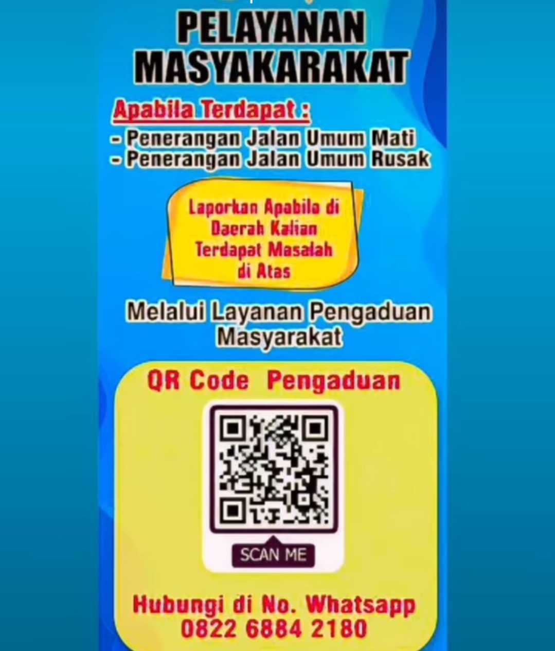 “Kepada masyarakat kabupaten Kampar dapat melaporkan apa bila terdapat Penerangan Jalan Umum ( PJU) Mati atau Rusak dapat melaporkan melalui pengaduan Layanan Masyarakat dengan cara scan kode OR atau melapor ke No. whatsapp 082268842180,” imbaun Dishub Kampar, dikutip dari akun Instagram @dishubkampar, Rabu (11/9/2024).