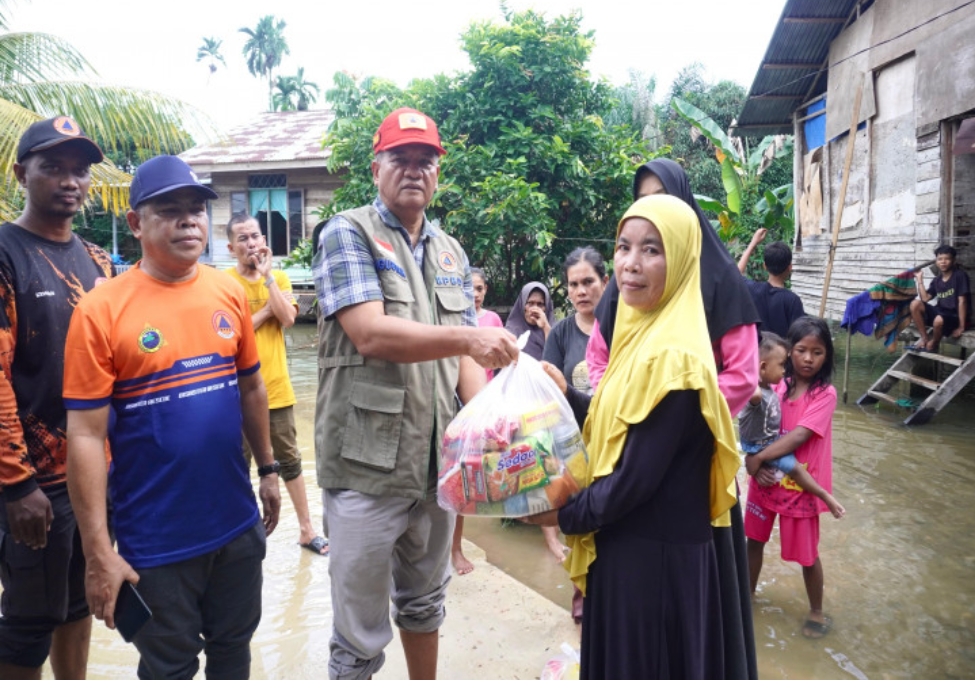Kalaksa BPBD Kampar menyerahkan bantuan ke warga terdampak banjir.