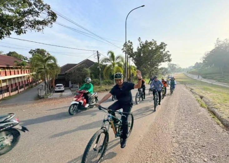 Kegiatan ini diawali dengan titik kumpul di Rumah kediaman Bupati, Jumat (10/4/2026) kemudian rombongan bergerak bersama menuju sejumlah kantor OPD di lingkungan Pemerintah Kabupaten Kampar. Dengan penuh semangat kebersamaan, Bupati Kampar tampak memimpin langsung rombongan menggunakan sepeda, diikuti para Kepala Dinas yang turut menggunakan sepeda maupun sepeda motor.